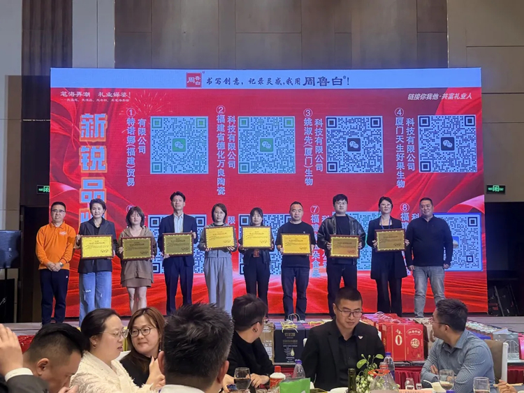 在本次颁奖环节中:新锐品牌由山东山野原粮农业科技有限公司总经理李慎波先生担任宣奖嘉宾,苏氏陶瓷总经理苏万良先生担任开奖嘉宾;金牌渠道服务商由深圳市迈戈科技股份有限公司总经理胡先牡女士颁发;卓越标杆由湖南家乡味道农业开发有限公司总经理蔡友源先生颁发;金牌政企礼赠服务商宣奖嘉宾由临沂乡味园生态农业有限公司总经理孙一健先生担任,开奖嘉宾为与时光同行品牌管理(北京)有限公司总经理时光女士;成长之星由深圳市康乐佰莲科技有限公司总经理屠礼享先生颁发。